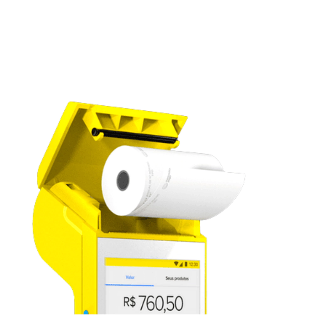 A maquininha não precisa estar conectada a um celular. Ela também imprime comprovantes e tem reposição de bobinas grátis.