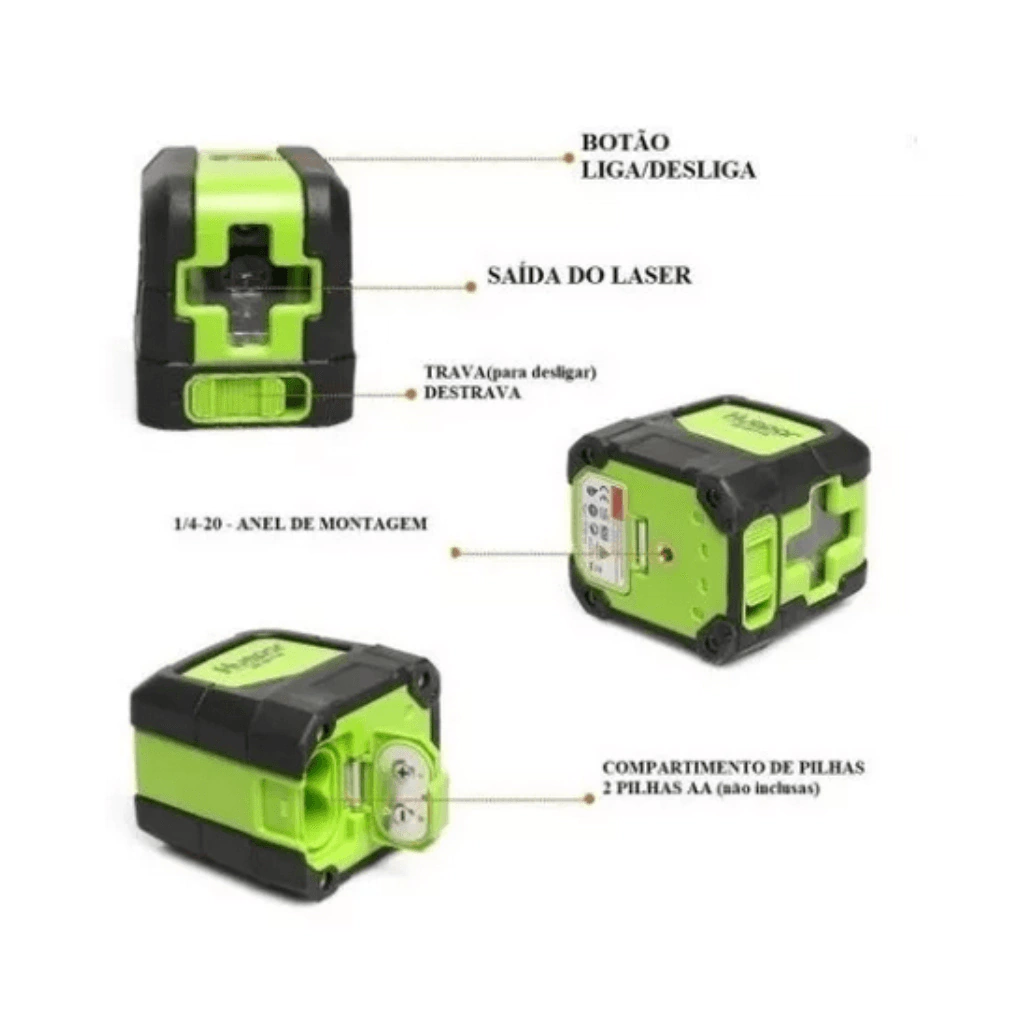 Tempo de funcionamento: verde: 6 horas com todos os raios laser em vermelho: 10Horas com todos os raios laser em